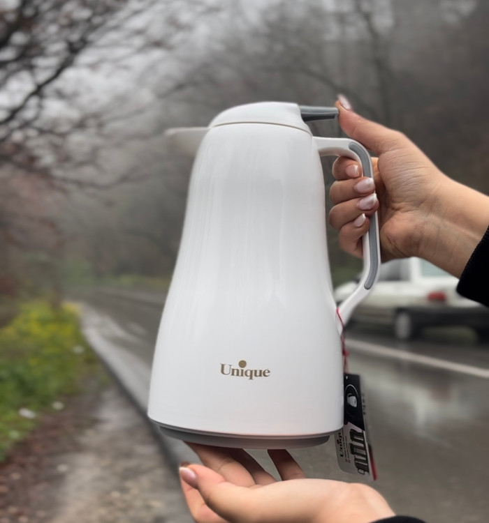 فلاسک یک لیتری یونیک داخل شیشه با قابلیت نگه داری چند ساعته آب گرم و نوشیدنی شما در رنگ سفید با حک برند یونیک
