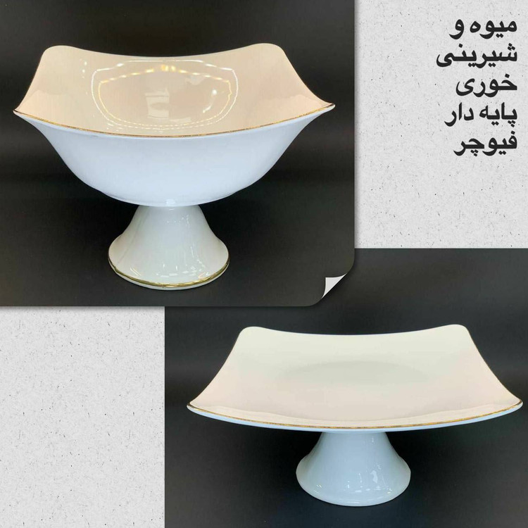 شیرینی خوری و میوه خوری پایه دار چینی برند مقصود لب طلایی