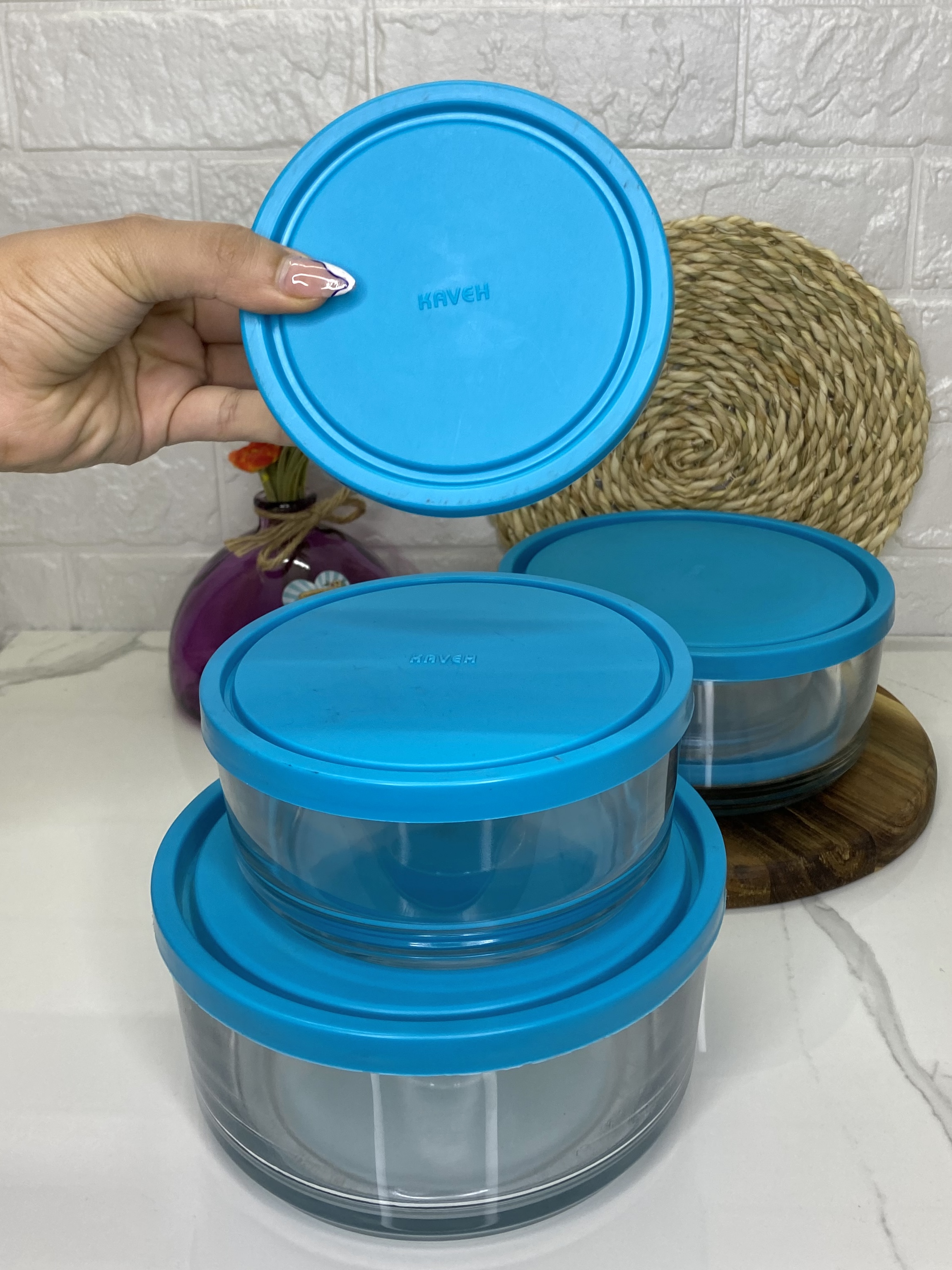 🏷️ظرف بلوری شیشهای ۳ تایی گرد دربدار برند کاوه