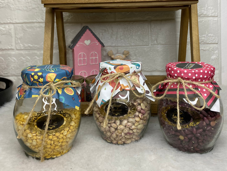 ظرف حبوبات شیشه ایی درب فلزی پیچی با روکش کاغذ تزئینی