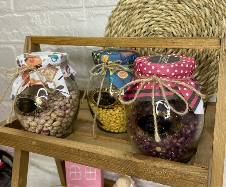 این ظرف حبوبات شیشهای با طراحی زیبا و درب فلزی پیچی، انتخابی عالی برای نگهداری مواد غذایی خشک است. شیشه شفاف باعث میشود محتویات به راحتی قابل مشاهده باشند و روکش کاغذی تزئینی ظاهری خاص به آشپزخانه شما میدهد