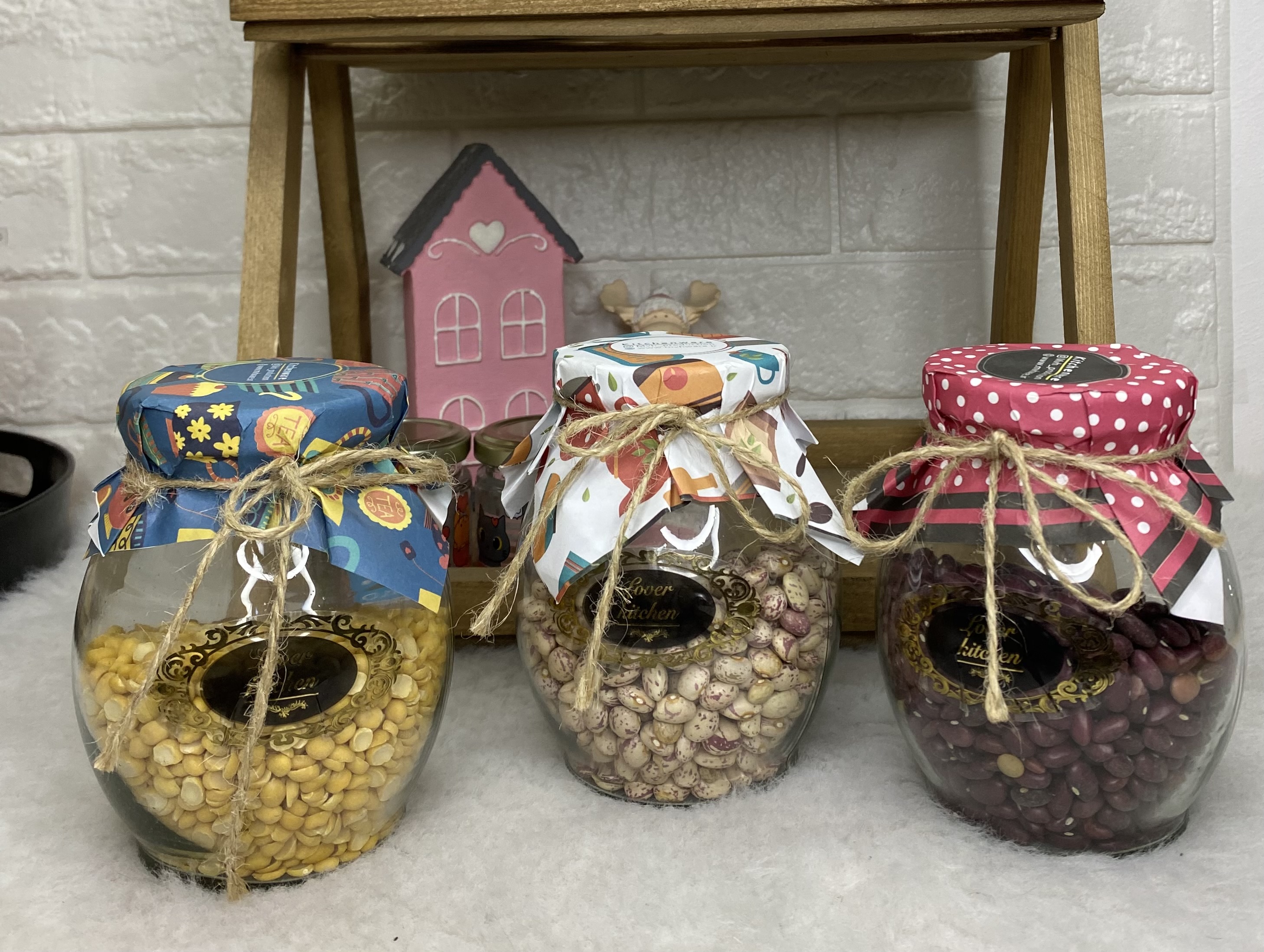 این ظرف حبوبات شیشهای با طراحی زیبا و درب فلزی پیچی، انتخابی عالی برای نگهداری مواد غذایی خشک است. شیشه شفاف باعث میشود محتویات به راحتی قابل مشاهده باشند و روکش کاغذی تزئینی ظاهری خاص به آشپزخانه شما میدهد