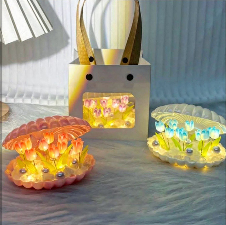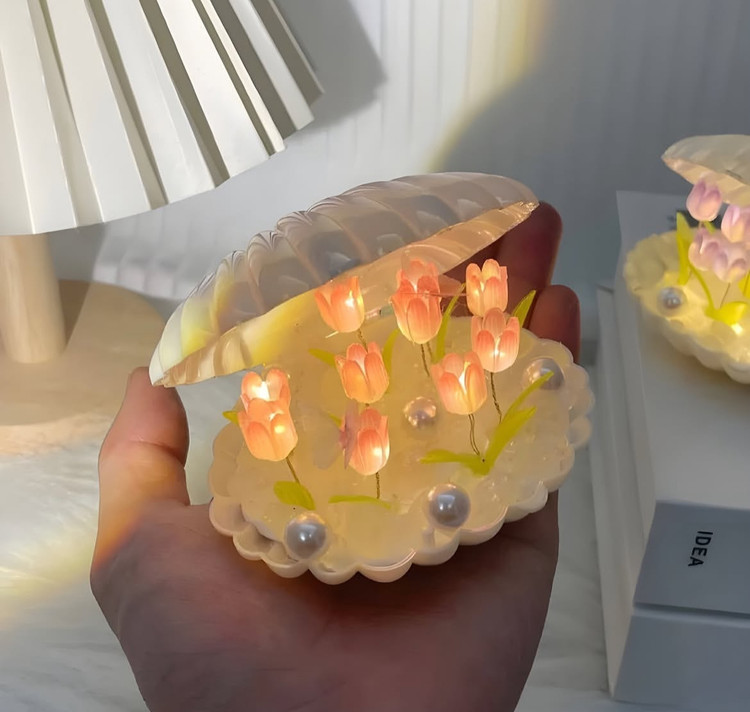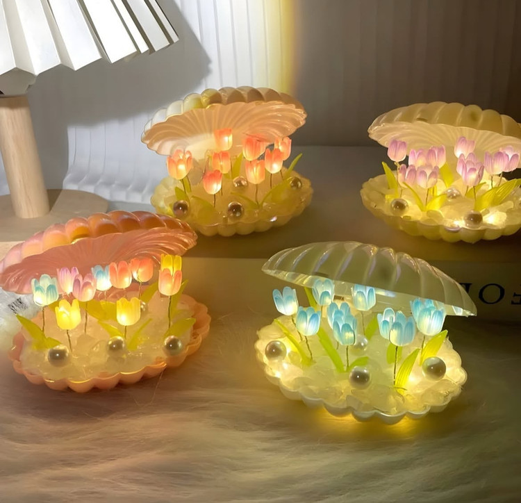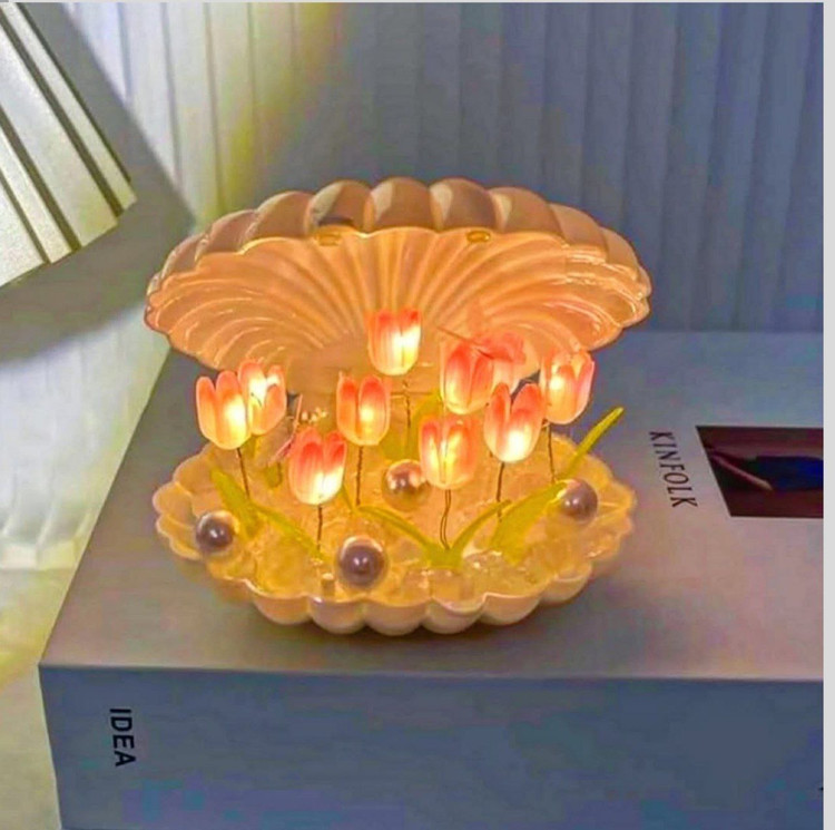 یه چراغ فانتزی و خاص با طرح صدف و لاله که وقتی روشن میشه، نورش آروم و دلنشین فضا رو قشنگ میکنه 💡