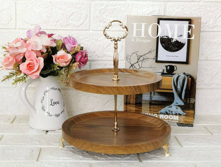 🏷️شیرینیخوری دو طبقه گرد چوبی | پایهدار با دسته طلایی؛