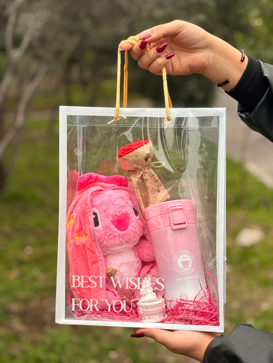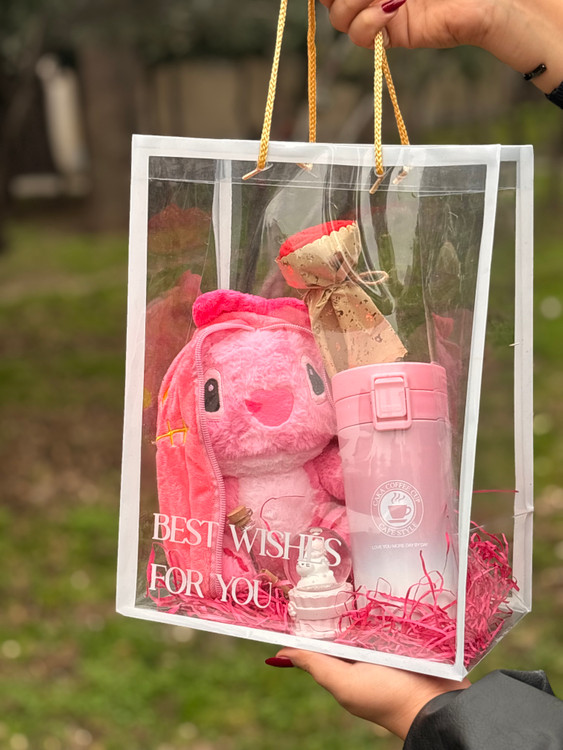 عروسک استیچ صورتی سوپرایزی - تراول ماگ صورتی -گل مصنوعی-گوی چراغ دار-شیشه عشق -پوشال -بگ طلقی