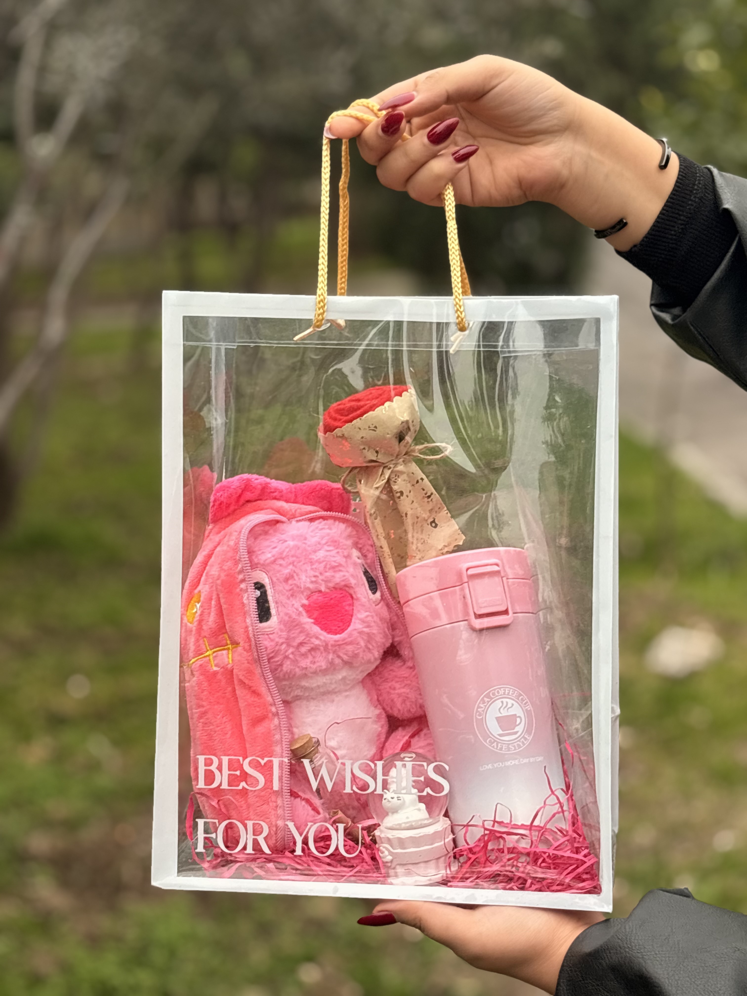 📍پک ولنتاین با تم استیچ صورتی، یک سورپرایز کامل و آماده هدیه. شامل تمام اجزای داخل تصویر: تراول ماگ، گوی شیشهای چراغدار، شیشه عشق، گل مصنوعی، پوشال تزئینی و بگ طلقی دستهدار. ترکیبی خاص و چشمگیر برای یه هدیه عاشقانه متفاوت.