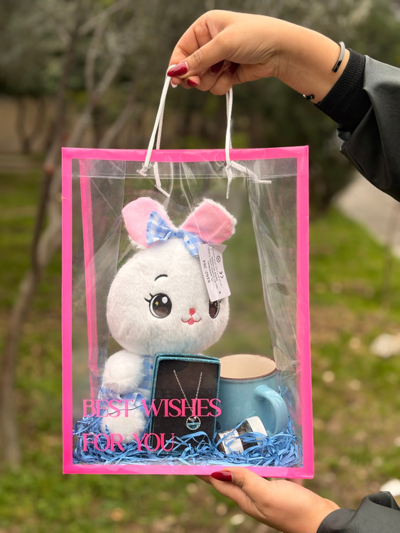 محتویات پک شامل: عروسک خرگوش پوشالی -گردنبند میناکاری شده-جعبه گردنبند-ماگ -نوتلا مینی-پوشال و بگ طلقی