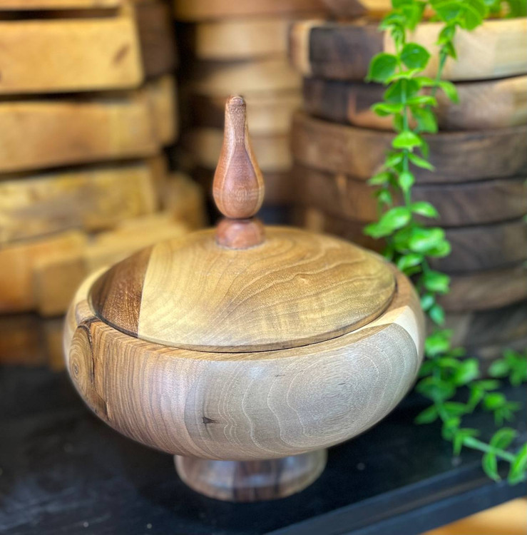📍شکلاتخوری ساختهشده از چوب طبیعی گردو با طراحی پایهدار و دربدار، مناسب نگهداری قند، شکلات و تنقلات کوچک. قطر ۱۲ سانت، جمعوجور و کاربردی برای میز پذیرایی با جلوهای گرم و اصیل.