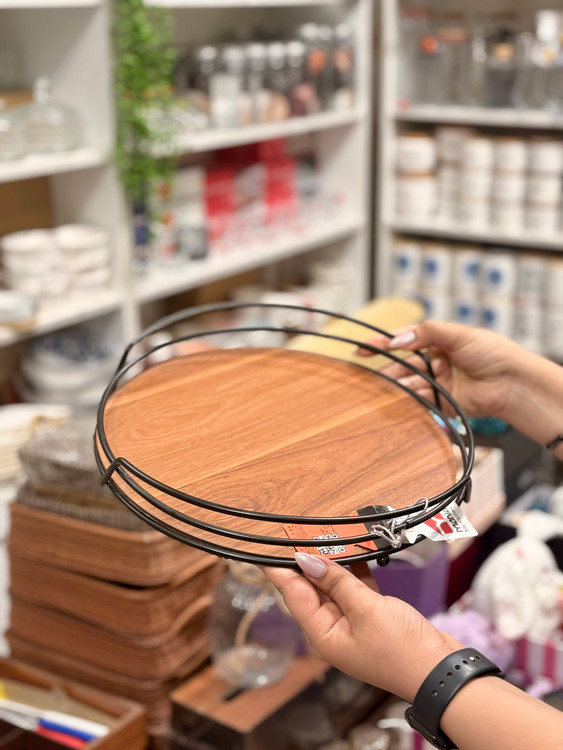 📍سینی پذیرایی ترکیب فلز و چوب با قطر ۲۹ سانت، دارای دسته برای جابهجایی راحت. مناسب سرو نوشیدنی، میوه و تنقلات با ظاهری مدرن و کاربردی.